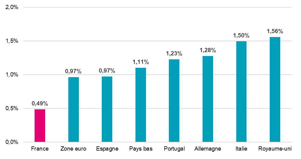 1. Le poids des services financiers dans l’indice des prix à la consommation pour l’ensemble des ménages est faible et en diminution, aujourd’hui en moyenne de 0,49%1 (source Eurostat – 2024). Il était de 0,7% il y a dix ans, soit 60% de plus qu’aujourd’hui. C’est deux fois inférieur à celui de la zone euro et plus de trois fois inférieur qu’en Italie ou au Royaume-Uni : le modèle bancaire français protège le pouvoir d’achat tout en offrant des services de qualité et en proximité.